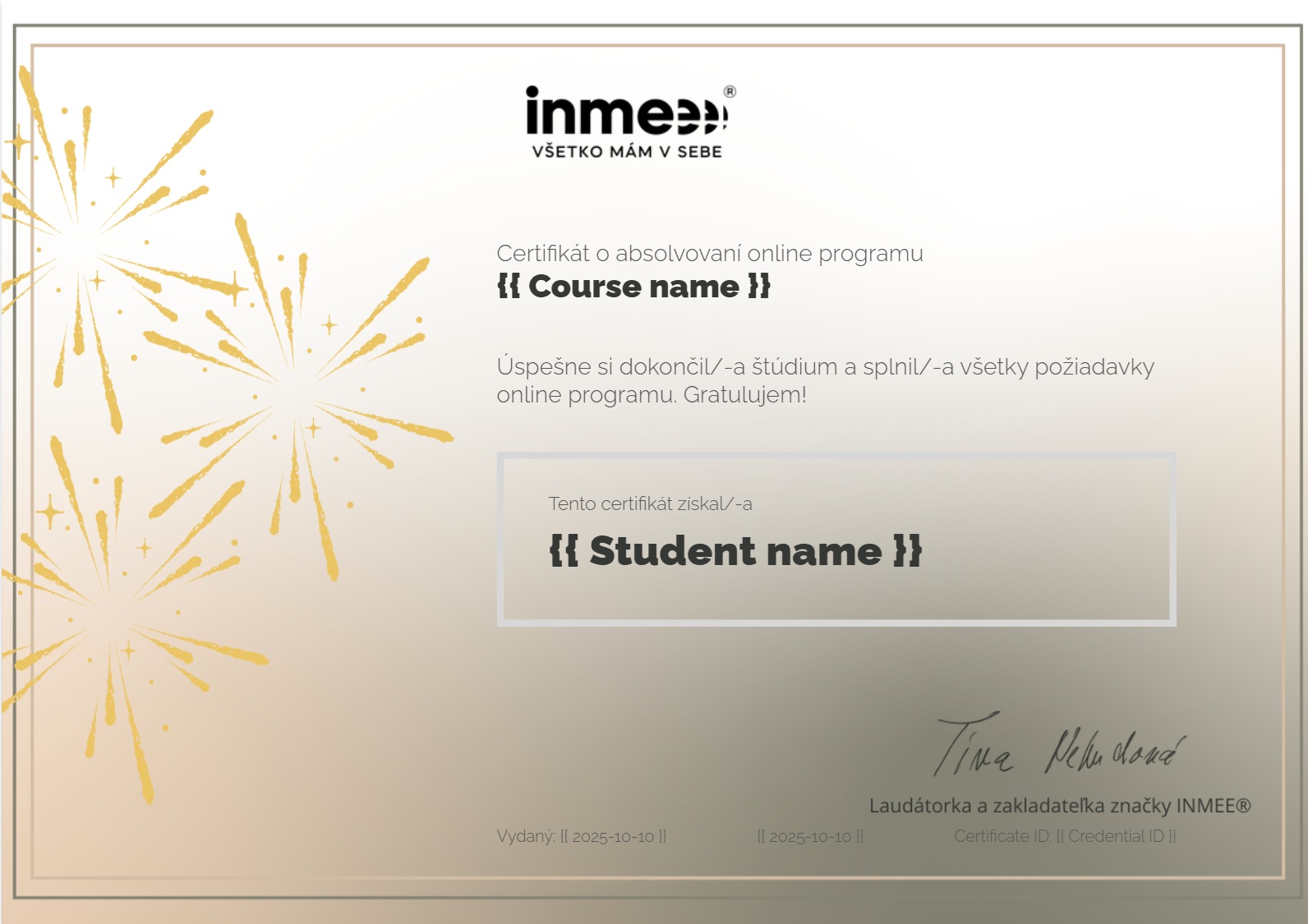 Každý krok v programe je navrhnutý tak, aby ťa posunul ďalej — aj keď sa občas zastavíš. Ak sa to stane, sme tu pre teba, môžeš sa kedykoľvek obrátiť na náš tím e-mailom na [email protected] alebo položiť otázku v komunite INMEE ACADEMY, ktorú máš počas štúdia programu stále k dipozícii.